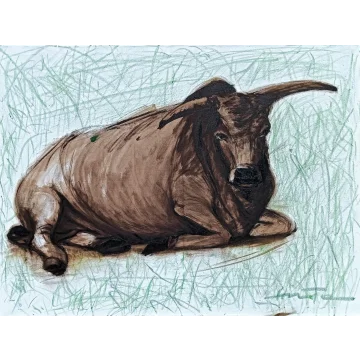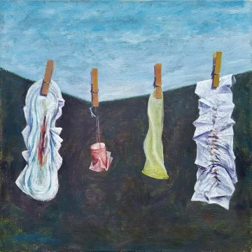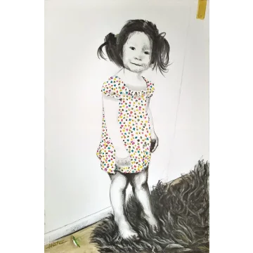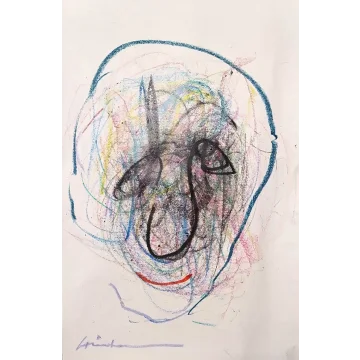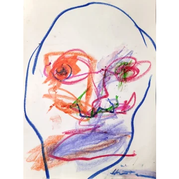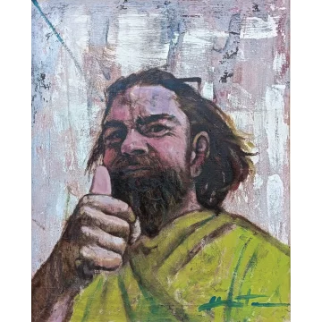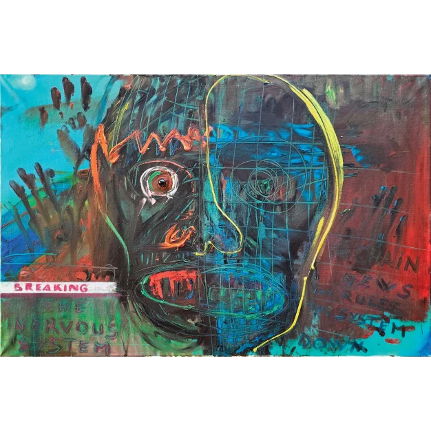 The idea of this painting was given by a tv channel, which in order to keep the peoples eyes on screen, stops each show in every 15 minutes with ‘Breaking News’. This was very annoying cause all of them was full of negativity and none of them were urgent or interesting. So, as angry as I was, I started to paint, trying to show all the anger I had inside… The portrait is somehow divided in 2 sections, where the right side with blue is under the influence of the negative news, with sadness, pain and uncertainty. The left side with glass eye, is powerfully angry and ready to break everything around, specially the Tv set, while he also was captured by these negatively influenced breaking news. The word BREAKING is part of the ‘breaking news’ title showed on tv. The other words are increasing this chaos even psyhically by reading them. This portrait with full of overwhelmed negative feelings in the end got a nervous breakdown.