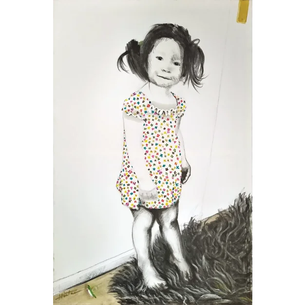The main inspiration for this work was my daughter Sarah Michelle and has a personally story. We agreed that she is a big girl now and doesn’t need the pacifier anymore. I promised her, if she will leave it, I make a drawing and stick it on canvas to be able to see it every day and she could even show it to her friends, to be proud of her. Upon hearing this, leaned against the wall and she threw it on the ground. This moment can be seen on canvas.